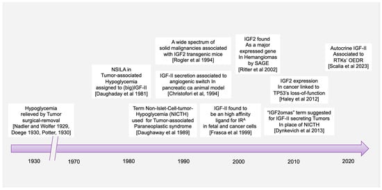 The earliest reports of the paraneoplastic syndrome associating what has been later referred as non-suppressible insulin-like activity (NSILA) [1] to hypoglycemia in cancer goes back to reports from W.H. Nadler and J.A. Wolfer in 1929 [2] and Karl W. Doege [3] and R.P. Potter in 1930 [4]. In possible oversight of the earlier report, the term of Doege–Potter Syndrome was adopted to describe these surgically treated intrathoracic tumors associated with hypoglycemia. Later reports confirmed that paraneoplastic hypoglycemia could indeed be found in cancers from all other (extra-thoracic) body districts and not limited to those of fibrous (connective/soft tissue) origin (namely sarcomas), as already suggested by the first under-looked report in 1929, but almost equally associated with epithelial/parenchymal tissue-derived cancers (carcinomas) [5]. The first findings linking IGF-II to cancer paraneoplastic hypoglycemia were related in the work of Doughaday et al. [6,7]. The added value of his work is linked to the observation that cancer-secreted IGF-II differs from physiologically produced IGF-II and that such difference confers cancer-secreted (“Big”)IGF-II key biologic advantages underlying its now widely proven autocrine loop effects. Specifically, cancer-secreted IGF-II corresponds to the IGF-II pro-hormone retaining its E domain, allowing its O-Glycosylation [6,8,9]. This processing defect increases the life-span and bioavailability of the IGF-II variants, both in the tumor microenvironment and in the systemic circulation, by reducing binding to IGFBP-3 and the IGF-II scavenger protein SpI2-6 (deceivingly known as the IGF-II “receptor” but actually causing IGF-II sequestration and degradation) [10,11,12]. The timeline of key discoveries connecting IGF-II to paraneoplastic hypoglycemia and proving its unique biological features are conveyed in Figure 1.