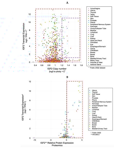 Relative RNA transcript expression of IGF-II transducing receptor tyrosine kinases in cancer cell lines. (A) Relative expression of IGF1R versus IGF2; (B) relative expression of Insulin receptor versus IGF2. Red boxed areas include those lines with relative expressions >1 fold, both in ligand and receptor, compared to normal and a group of tumoral cells. Purple boxed areas correspond to those tumoral cells with relatively normal levels and isolated elevated levels of either IGF2 or its RTK signal-transducing receptor transcripts. The source of the data used for Figure 5 is conveyed in the Supplemental Material (SM2).