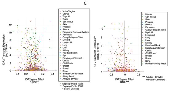 Indeed, the idea of IGF-II secretion as a rare associated event in cancer has been maintained in the scientific literature till present [29], somehow implying that IGF-II-secreting tumors could be mostly benign in nature and fully surgically treatable. This has motivated a group of authors to name such tumors as “IGF2omas” recalling the rare and surgically removable features of the early reports [5]. However, the cumulative evidence based on expression studies conducted at the histological and cellular level suggests a different scenario than that proposed by clinical reports of its rarer hypoglycemic-associated syndrome. In fact, based on the retrospective analysis of the published literature, which we conveyed herein in Figure 1 and Table 1, it is clear that IGF-II secretion in tumors is a much more common event than generally implied by IGF studies focusing on mechanistic and reductionistic experimental design. Interestingly, IGF-II expression by cancer cells and bioptic tissues from solid malignancies exceeds, by several orders of magnitude, the number of cancers overtly displaying hypoglycemia. Although there is still not sufficient published evidence, increases in hypoxia and CO2 levels with resultant body acidification in cancer patients may also result as a highly associated event with IGF-II secretion in patients diagnosed with a solid tumor. The rational for this predicted association is based on the demonstrated IGF-II expression increase in response to HIF-1 stimuli reported in a variety of experimental cancer models [30]. To further characterize the expression levels and patterns of IGF-II in cancer, we turned to the DepMap expression database, a publicly available tool managed by the Broad Institute [31] (available at https://depmap.org/portal/ accessed on 24 September 2023), and focused on a few key parameters conveyed in Figure 3. This analysis, relative to a number of well-characterized human-derived cancer cell lines, has provided the following results:
