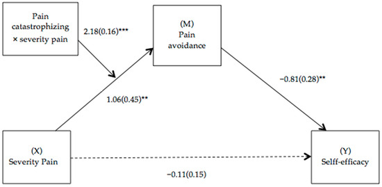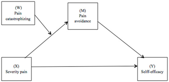 Furthermore, based on previous research [10,21,22], where the impact of pain catastrophization on the perception of pain severity has been demonstrated, it could be hypothesized that pain avoidance could mediate the relationship between pain severity and self-efficacy, taking into account the moderating effect of pain catastrophizing on the relationship between pain severity and pain avoidance.