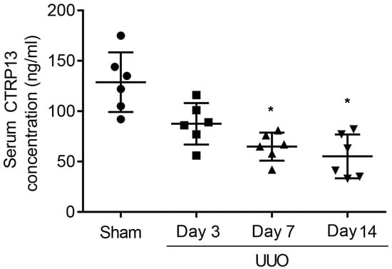 Plasma CTRP13 levels were decreased in the UUO mice with renal fibrosis. The concentration of CTRP13 in the mouse kidney at 3, 7, and 14 days after UUO surgery. * p < 0.05 versus Sham group.