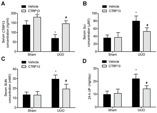 Subsequently, the effect of administering CTRP13 on the UUO-mediated renal fibrosis model in C57BL/6 mice was investigated. CTRP13 was injected into mice every other day for 2 weeks, and the serum CTRP13 levels were found to have been successfully increased (Figure 2A and Table S2). As shown in Figure 2B,D and Table S2, after 2 weeks of treatment, the levels of BUN, SCr, and 24 h UP were statistically markedly different comparing between the sham and the UUO groups. Furthermore, CTRP13 treatment led to a reduction in the levels of Scr and Bun as well as those of 24 h UP, suggesting that ectopic CTRP13 infusion led to the alleviation of UUO-mediated renal function deterioration in vivo.