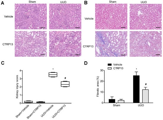 Kidney fibrosis is identified by tubule atrophy, interstitial chronic inflammation and fibrogenesis, glomerulosclerosis, and vascular rarefaction []. As shown in Figure 3A,B, kidney fibrosis and injuries were assessed via Masson and H&E staining. Following UUO surgery, the tubules were found to be markedly dilated, with extensive interstitial fibrosis and massive inflammatory cell infiltration. Following intervention with CTRP13, histopathological damage and interstitial fibrosis were found to be reduced; moreover, glomerular and tubular malformations were reversed. The injury scores of the kidneys and the area of fibrosis both indicated that CTRP13 exerts a protective effect on UUO-mediated kidney fibrosis and pathological injury (Figure 3C,D).