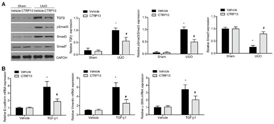CTRP13 mediates UUO-induced TGF-β1/smads signaling pathway transduction. (A) Representative Western blot analysis of TGF-β1, Smad3, phosphorylated Smad3, and Smad7 in the kidney of UUO mice. (B) Quantitative real-time PCR analysis of α-SMA, VIM, and COL I in NRK-49F cells after TGF-β1 treatment. * p < 0.05 versus Sham+Vehicle or Vehicle group. # p < 0.05 versus UUO+Vehicle or TGF-β1+Vehicle group.
