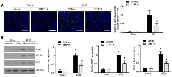 CTRP13 inhibits renal inflammation in UUO mice. (A) Representative immunofluorescence staining of F4/80 in the kidney of UUO mice. Scale bar = 50 μm. (B) Representative Western blot analysis of MCP-1, IL-1β, and IL-6 in the kidney of UUO mice. * p < 0.05 versus Sham+Vehicle group. # p < 0.05 versus UUO+Vehicle group.