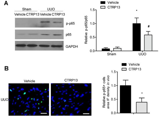 CTRP13 suppresses UUO-induced NF-κB p65 signaling pathway activation. (A) Representative Western blot analysis of P65 and phosphorylated p65 in the kidney of UUO mice. (B) Representative immunofluorescence staining of phosphorylated p65 in the kidney of UUO mice. Scale bar = 50 μm. * p < 0.05 versus Sham+Vehicle or Vehicle (UUO) group. # p < 0.05 versus UUO+Vehicle group.