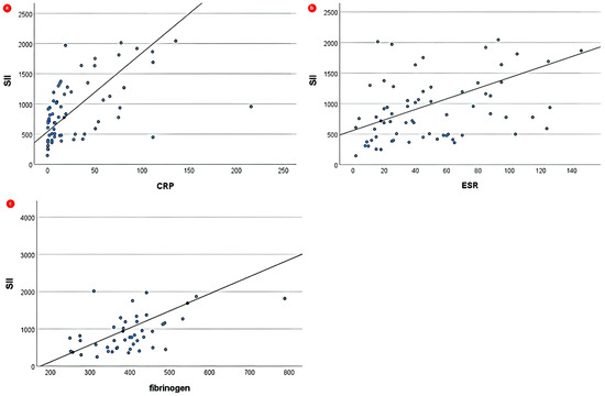 Correlations between SII and (a) CRP, (b) ESR, and (c) fibrinogen across JIA group. Solid lines represent linear regression lines.