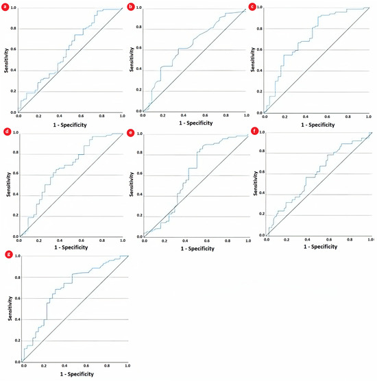 ROC curve of (a) CRP, (b) ESR, (c) SII, (d) NLR, (e) neutrophils, (f) lymphocytes, and (g) platelets for predicting partial clinical remission.
