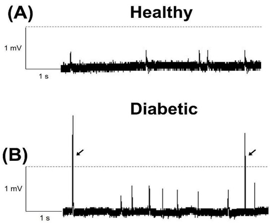 Martínez-Sánchez, J.E.; Cárdenas, Y.; Trujillo, X.; Ríos-Silva, M.; Díaz-Reval, M.I.; Bricio-Barrios, J.A.; Muñiz, J.; Alcaraz-Siqueiros, J.; Huerta, M. Increased Frequency of Giant Miniature End-Plate Potentials at the Neuromuscular Junction in Diabetic Rats. Biomedicines 2024, 12, 68. https://doi.org/10.3390/biomedicines12010068