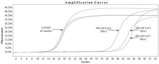 In contrast, hypoxia appears to induce HBA2 transcription in HBMEC, with a dose-dependent increase in the amount of detectable messenger RNA observed after 48 h. Figure 3 depicts representative amplification curves demonstrating that, while GAPDH cycle calls for CoCl2 dose responses remain consistent, detectable levels of HBA2 appear to increase in correlation with dose. It is also worth noting that HBA2 was found to be a rare transcript in our model for resting cells, which prevented both accurate amplification and relative expression calculation versus diluent controls. To support this observation, ΔCt amplification call measurements for HBA2 to GAPDH were calculated for the corresponding experiment shown in Figure 3, which was performed in triplicate. Using this method, we observed ΔCts of 26.1 ± 0.4, 24.6 ± 0.8, and 21.8 ± 0.2 for 100, 200, and 500 μM final concentrations of CoCl2, respectively. This would imply that as the concentration of CoCl2 increases, so does the detectable amount of HBA2 messenger RNA. Furthermore, as seen in the diluent controls, cytokine treatment did not result in detectable HBA2 amplification (none detected). Together, these findings suggest that HIF-1 signaling increases Hbα transcription.