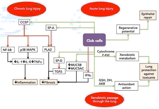 A decade ago, Celli and Owen announced the arrival of “the time to shine” for club cells and for their secretory molecule, CC16 []. This statement was based on the accumulated data from animal experiments which showed a distinct role of these cells in epithelial repair and in the defense mechanisms of the lung. Another important reason to push for the continuation of the investigation of these cells, was the reporting of the secretion of the club cell secretory protein (CCSP) after exposure to environmental pollutants, followed, in chronic exposure, by a reduction in CCSP. The interest in these cells in lung fibrosis is due to their role in the regeneration of injured epithelia, in the metabolism of respiratory toxicants, and due to the secretion of CCSP, which modulates the activity of TGBβ and IFNγ in the distal airways [].