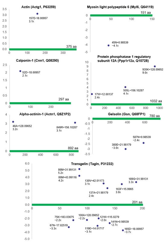 This figure shows the modified residues of contractile proteins and their associated proteins (R2 > 0.5, ratio > 2, p < 0.05). Each dot represents the ncAA of a specific protein. The annotation information for each dot is as follows: modified (protein) position, modified amino acid residue, delta mass, and ratio of modification. The horizontal axis represents the amino acid position of each protein; the vertical axis represents the ratio of modification (up or down). aa = amino acid.