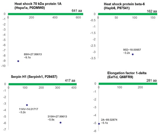 Stress response proteins were also markedly affected by bladder ischemia, showing differential (post-translational) modifications of the proteins, including heat shock 70 kDa protein 1A (Hspa1a, P0DMW0), heat shock protein beta-6 (Hspb6, P97541), serpin H1 (Serpinh1, P29457), and elongation factor 1-delta (Eef1d, Q68FR9) (Figure 3).