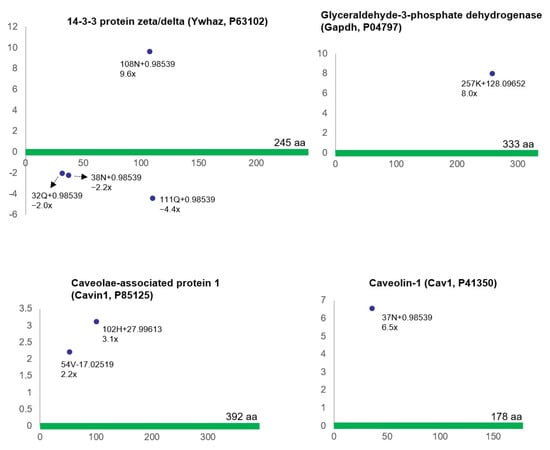In addition, proteomic analysis of the ischemia-associated ncAA-containing proteins revealed differential (post-translational) modifications of the cell signaling-related proteins, including 14-3-3 protein zeta/delta (Ywhaz, P63102), glyceraldehyde-3-phosphate dehydrogenase (Gapdh, P04797), caveolae-associated protein 1 (Cavin1, P85125), and caveolin-1 (Cav1, P41350). Cell signaling-related proteins regulate cellular responses to a diverse, multifaceted, and alternating mix of signals involved in protein expression, protein localization, protein endeavor, and protein–protein interactions [,,,]. These proteins are involved in critical aspects of signal transduction, modulating critical cellular responses to a nearly unlimited set of stimuli [,,,]. Our data suggest that the differential (post-translational) modifications of cell signaling-related proteins in the ischemic bladder may vary depending on the sensitivity, duration, and dynamics of the cellular stress response to ischemia. Signal-dependent modifications in the expression levels and PTMs of cell signaling-related proteins may play an important role in the regulation of downstream processes including protein degradation, localization, and protein-protein interactions [,,,]. The activity of cell signaling-related proteins is tightly regulated so that the products of the responses that they control are only elicited at the appropriate time when cells are stressed and signal danger [,,,]. It seems that some of the regulatory mechanisms involve protein expression or protein localization, but crucial functional consequences result from the regulation of protein activity by PTMs of the signaling molecule, intramolecular crosstalk between different domains within the protein, and/or activation of crosstalk mechanisms with other proteins [,,,]. A limitation of our proteomic analysis may relate to the sample size of 3 animals per group. However, LC-MS/MS analysis yielded an extensive proteomic dataset with a very large amount of data to be analyzed and interpreted. In LC-MS/MS analysis, each sample was run three times. We extracted proteins from each animal, ran SDS-PAGE, and divided them into 10 gel fragments. After sample preparations (in-gel digestions) from each 10 fragments, each sample of 10 was analyzed three times in LC-MS/MS. Therefore, each animal generated 30 sets of MS/MS data, allowing proper data interpretation with exploratory data analysis.