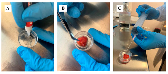 Sequence of sample preparation: the glue was placed on the Petri dish (A), the sample was placed on the glue with the smoother side exposed (B), and the sample was submerged in physiological solution after waiting a few minutes for the glue to dry (C).