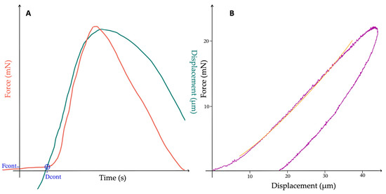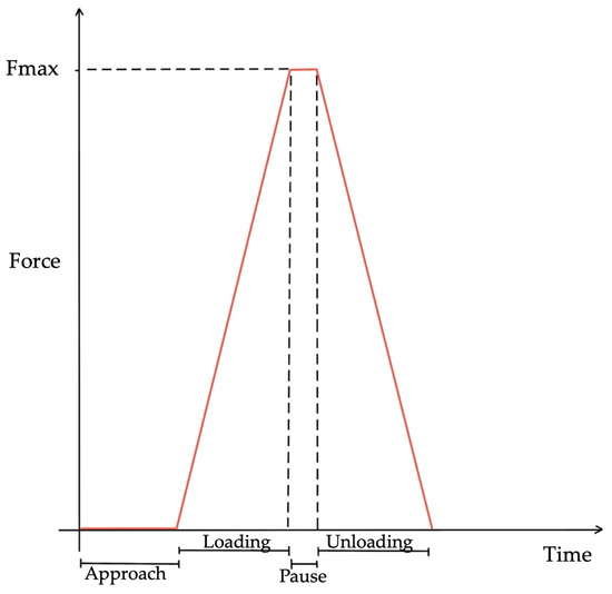 - Force–time and displacement–time curves: these curves allow for the identification of the approach, loading phase, pause, and unloading phase (Figure 4A);