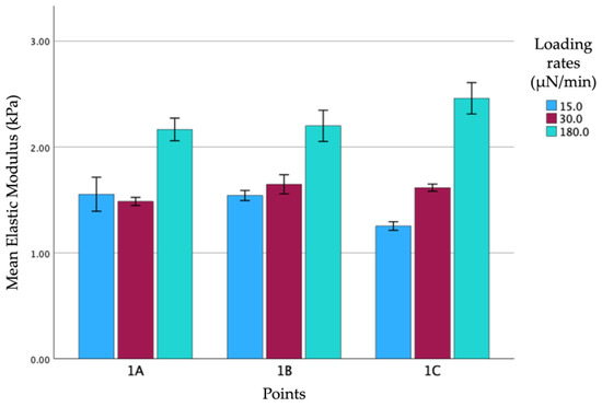 Comparison of different loading rates for three different points of the same specimen (1A, 1B, 1C): blue (180 µN/min), reddish-purple (30 µN/min), and light blue (15 µN/min). For each condition considered, the error is reported as the standard deviation.