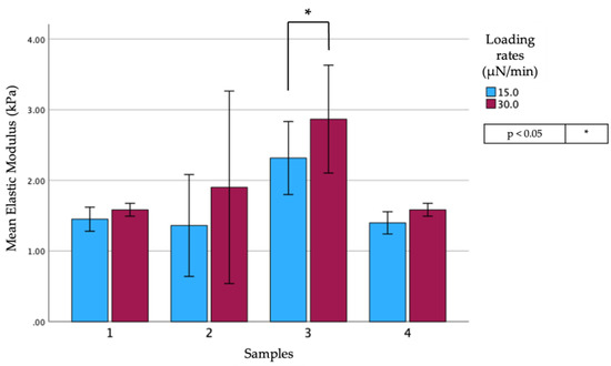 Regarding the differences between slow (30 µN/min) and extra-slow (15 µN/min) loading rates, the analysis performed after averaging all the samples revealed no statistically significant differences with an average of 1.98 ± 0.92 for the slow and of 1.64 ± 0.61 for the extra slow loading rates. When the samples were considered separately (Figure 6), the differences were revealed to be statistically significant only in the third analysis.
