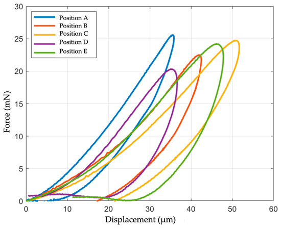 The pause during indentation was set at 5 s to ensure that the maximum load was reached before the unloading step commenced. The unloading was executed at the same speed as the loading.