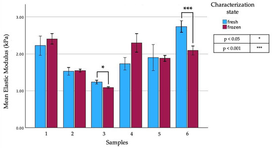 We conducted an analysis and comparison of the mean values of EHz to identify the presence of statistically significant differences during multipoint indentations performed at various loading rates and before and after freezing the samples.