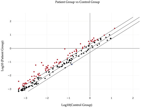 In Figure 1 the general distribution of the studied group is represented, showing the multitude of miRNAs that are upregulated/downregulated in the patient group compared to the normal group.