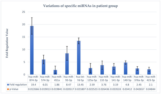 Following the preliminary analysis, these hsa-miRNAs showed significant fold regulations in the patient group versus the control group. They are considered statistically significant, and some have been identified in the literature as reported by other researchers.