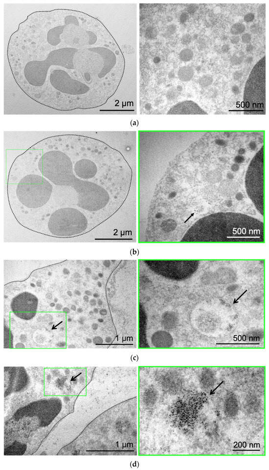 MNP-Cy5 localization in neutrophil blood isolated from the 4T1 tumor-bearing mice: (a) microphotographs of control neutrophils cultivated in growth medium; (b–d) microphotographs of neutrophils incubated with MNPs-Cy5 for 1 h. TEM, green frames indicate areas of cells demonstrated at higher magnification, and arrows point to individual NPs (b) or NP conglomerates (c) inside vesicles or cytoplasm (d).