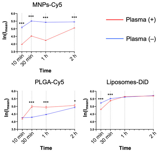 Serum factors can significantly affect NP interactions with the cells, both enhancing or preventing NP uptake. For this reason, the NP interaction with neutrophils was studied in the presence or absence of murine plasma (medium:blood plasma = 1:1, v:v). MNPs-Cy5 interacted with neutrophils in the absence of plasma more efficiently, while PLGA-Cy5 NPs accumulated faster in the presence of plasma (Figure 3), and liposome-DiD interaction with the cells was not affected by the cultivation conditions. The accumulation peak of all NP types in cells was observed after 1 h of co-incubation in most cases, subsequently reaching a plateau.