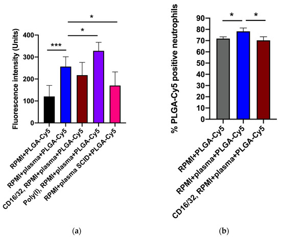 Pre-incubation of neutrophils with antibodies to CD16/32 resulted in a small but statistically significant decrease in the efficiency of PLGA-Cy5 NP interactions with cells (Figure 5). Scavenger receptor-blocking with Poly(I) did not inhibit NPs binding by neutrophils (Figure 5a). Finally, cultivation of cells in a medium supplemented with plasma from SCID mice led to a decrease in the Cy5 signal intensity in neutrophils.