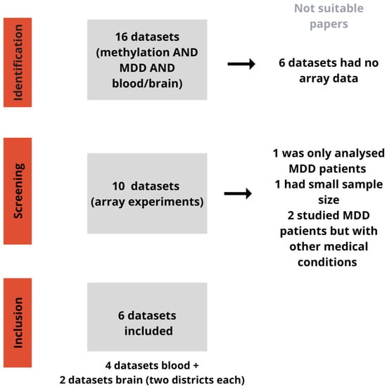 Workflow for dataset selection. This picture shows the workflow for identifying datasets related to methylation and MDD in blood and brain samples. During the identification step, 6 out of 16 datasets were discarded due to lack of array data. From the remaining 10 datasets, 4 were excluded for various reasons: one only analysed MDD patients, one had a small sample size, and two studied MDD patients with other medical conditions. Eventually, 6 datasets were included for analysis: 4 from blood samples and 2 from brain samples (with two brain districts each).
