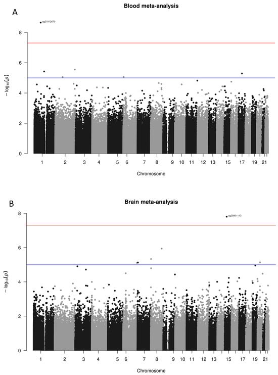 Manhattan plots of meta-analysed differential methylation analyses, divided by results observed in blood tissue (A) and brain tissue (B). In both graphs, the x-axis represents the chromosomes where the probes are located. The y-axis represents the negative base-10 logarithm of the association p-value, with a red horizontal line indicating the threshold for significant unadjusted p-value (suggestive significance threshold shown with the blue line at 10−5). Few reached the suggestive threshold, while only two probes cg21812670 in blood and cg2580113 in the brain went even beyond the 10−7 (red line). Note that the only probe still significant (FDR < 0.05) after the multiple testing correction was the cg25801113.