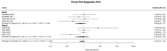 The meta-analysis was performed to combine results from differential methylation analyses for both tissues. This synthesis was conducted separately for blood and brain samples to ensure comprehensive analysis. In the context of brain differential methylation analysis, separate investigations were carried out for different brain areas. However, the individual findings from these separate studies were later combined and summarised together in a meta-analysis. The meta-analyses aimed to provide a more comprehensive and integrated understanding of the overall differential methylation patterns across various brain regions, offering valuable insights into the epigenetic differences that may be associated with specific brain functions or conditions. The software METAL was used, which is a specific tool to perform meta-analyses at genome-wide and epigenome-wide levels []. Moreover, the same approach was applied to gather information on age acceleration analysis and epigenetic drift for both tissues. A mixed-effects model was applied, in which the hypothesis is that the observed differences could be due to differences between studies. The goal was to obtain a summary estimate for the effect size. This analysis was conducted through the metafor, which provided, in addition to pooled estimates, statistics regarding heterogeneity such as the Q statistic and the I2 statistic [].