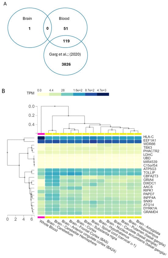 (A) Venn diagram in describing the intersection of genes lists. From epivariations, we identified 51 genes from blood tissues and 1 gene emerged from the brain. An intersection was performed with the list of genes involved in epivariations in blood, the list with epivariated genes in brain, and the list with epivariations provided by Garg et al. (2020) []. (B) Expressions of the epivariated genes found in brain and blood. The expressions of the epivariated genes (present in 0 controls and in more than 3 cases) were analysed with GTEx. Expression is quantified as transcripts per million (TPM), which is the ratio of number of transcripts per gene over the total number of transcripts in the sample multiplied by 106.