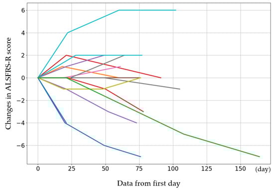 The initial ALSFRS-R score for each case and the changes in score after the 4th, 8th, and 12th administrations. The cases show increases or maintenance in scores. The colors are used to distinguish individual cases and do not represent differences in variables.