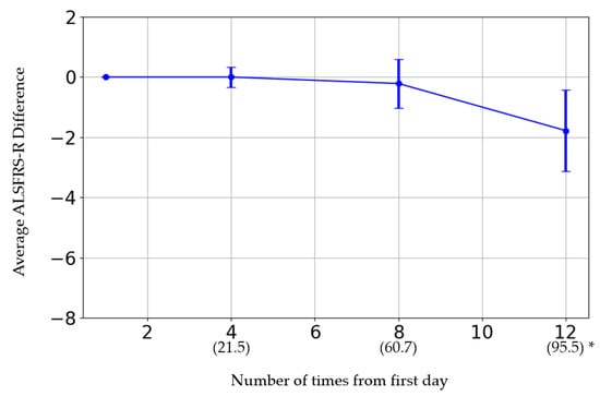 The initial ALSFRS-R score and the changes in score after the fourth, eighth, and twelfth administrations are presented in Figure 1. The participants were categorized by sex into three groups: those whose scores improved, those who remained the same, and those who deteriorated. Women showed a greater improvement than men (p = 0.08) (Table 6). The average rate of change in the score after each administration was calculated and evaluated (Figure 2). The average score change at the fourth administration was 0.0 points (standard error (SE) = 0.32), whereas those at the eighth and twelfth administrations were −0.21 (SE = 0.81) and −1.77 (SE = 1.35), respectively. A detailed analysis of individual patient data revealed cases where the score remained unchanged, as well as where the score improved. For forced vital capacity and grip strength, several data points were missing, making overall evaluation challenging.