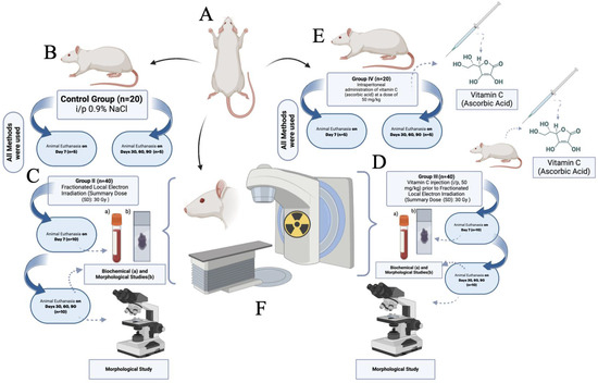 Design of the experiment. Special annotations: (A)—random allocation of animals into groups (following preliminary assessments); (B)—control group (animals received 0.9% saline i/p injection); (C)—Group II: animals received a Summary Fractional Dose of 30 Gy; (D)—Group III: prior to irradiation with a Summary Fractional Dose of 30 Gray, animals received vitamin C (ascorbic acid, 50 mg/kg, i/p injection); (E)—Group IV: animals received vitamin C i/p injections (ascorbic acid, 50 mg/kg); (F)—irradiation of the animals was performed using a specialized device (NOVAC-11, S.I.T. Sordina IORT Technologies S.P.A., Vicenza, Italy) according to the study design and methods.