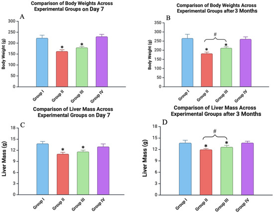 Comparison of body weight and liver mass across experimental groups at different time points: (A) body weight of animals on day 7; (B) body weight of animals after 3 months; (C) liver mass of animals on day 7; (D) liver mass of animals after 3 months. Experimental groups are numbered according to the study design. All data are presented as mean ± SD. Statistically significant differences are indicated by symbols: *—comparison with control group (p < 0.05); #—comparison between Groups II and III (p < 0.05).