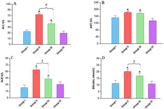 Biochemical analysis of blood serum (on day 7): (A) ALT (alanine aminotransferase) level; (B) AST (aspartate aminotransferase) level; (C) ALP (alkaline phosphatase) level; (D) total bilirubin level. Experimental groups are numbered according to the study design. All data are presented as mean ± SD. Statistically significant differences are indicated by symbols: *—comparison with control group (p < 0.05); #—comparison between Groups II and III (p < 0.05).