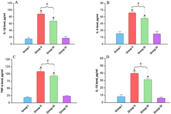 Levels of different cytokines in blood serum of experimental groups (on day 7): (A) level of IL-1β; (B) level of IL-6; (C) level of TNF-α; (D) level of IL-10. Experimental groups are numbered according to the study design. All data are presented as mean ± SD. Statistically significant differences are indicated by symbols: *—comparison with control group (p < 0.05); #—comparison between Groups II and III (p < 0.05).