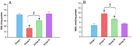 Levels of different markers of oxidative stress in liver homogenate of experimental groups (on day 7): (A) level of SOD; (B) level of MDA. Experimental groups are numbered according to the study design. All data are presented as mean ± SD. Statistically significant differences are indicated by symbols: *—comparison with control group (p < 0.05); #—comparison between Groups II and III (p < 0.05).