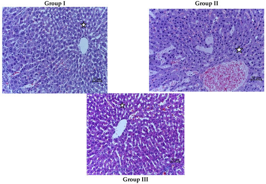 H&E stained liver fragments from the control (Group I), irradiated group (Group II), irradiated group with the introduction of ascorbic acid (Group III). Magn.: ×400; star—central vein; scale bar—50 µm.