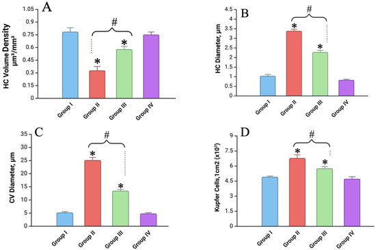 Liver studies of all experimental groups (on 7 days): (A) indicators of volumetric density of hepatocytes (HC) (in µm3;/mm2); (B) diameter of hepatocytes (in µm); (C) diameter of the central vein (CV, in µm); (D) number of Kupffer cells in 1 cm2 (×103). Experimental groups are numbered according to the study design. All data are presented as mean ± SD. Statistically significant differences are indicated by symbols: *—comparison with control group (p < 0.05); #—comparison between Groups II and III (p < 0.05).