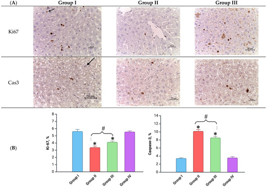 Livers of the control and experimental groups: (A) immunohistochemical reactions with antibodies to Ki-67 (top row) and caspase 3 (bottom row) (magnification: ×400); (B) proliferation–apoptosis ratio in hepatocytes according to the results of an immunohistochemical study (scale bar—50 µm). Experimental groups are numbered according to the study design. All data are presented as mean ± SD. Statistically significant differences are indicated by symbols: *—comparison with control group (p < 0.05); #—comparison between Groups II and III (p < 0.05).