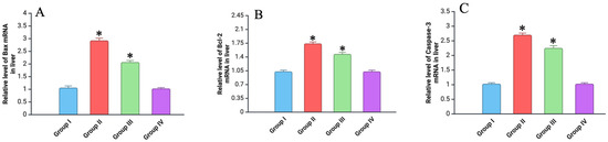 To evaluate the effects of electron beam irradiation and vitamin C administration on the expression levels of the Bax, Bcl-2, and caspase-3 genes in liver tissues, real-time PCR was performed. The results (on day 7) demonstrated significant alterations in gene expression across the experimental groups, consistent with the expected apoptotic and anti-apoptotic responses. For example, in the second group, a substantial upregulation of Bax mRNA expression was observed compared to the control group, indicating an increase in pro-apoptotic signaling (Figure 9). Conversely, the expression of Bcl-2, an anti-apoptotic gene, was also elevated, albeit to a lesser extent. This resulted in an increased Bax/Bcl-2 ratio, suggesting a tilt towards apoptosis in the liver cells post-irradiation. In contrast, the third group exhibited a moderate response. While both Bax and Bcl-2 expression was still elevated compared to the control, the increase was significantly less pronounced than in the irradiation-only group. This was reflected in a more balanced Bax/Bcl-2 ratio, implying that vitamin C administration may help in reducing the extent of apoptosis triggered by irradiation.
