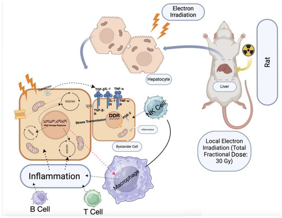 RILD is primarily driven by oxidative stress, which activates complex molecular pathways leading to significant hepatic injury. Following radiation exposure, the overproduction of reactive oxygen species (ROS) results in mitochondrial dysfunction and mitochondrial DNA (mtDNA) damage, sensitizing hepatocytes and activating non-parenchymal cells such as Kupffer cells (KCs) and hepatic stellate cells (HSCs) [1,13,14]. These activated cells further exacerbate liver damage by releasing pro-inflammatory cytokines, including TNF-α, IL-1, and IL-6, which amplify the inflammatory response [15,16]. Additionally, critical signaling pathways involving NF-κB and Nrf2 play pivotal roles in modulating the liver’s response to radiation-induced damage. NF-κB serves as a central mediator of inflammation by promoting the expression of pro-inflammatory genes, while Nrf2 regulates antioxidant defenses, providing protection against ROS-induced damage [17,18]. As oxidative stress intensifies, key enzymes such as superoxide dismutase (SOD) attempt to neutralize superoxide radicals, while malondialdehyde (MDA) serves as a marker of lipid peroxidation and oxidative damage within liver tissues [18,19]. Despite these protective mechanisms, prolonged oxidative stress often overwhelms them, leading to sustained activation of HSCs and increased levels of the fibrogenic cytokine TGF-β, which stimulates the synthesis of extracellular matrix components like collagen, promoting fibrosis and long-term liver damage [20]. The chronic nature of radiation injury, tipping the balance toward persistent fibrogenesis and apoptosis, underscores the complexity of RILD. This intricate interplay of oxidative stress, inflammation, and signaling pathways necessitates further research to elucidate the specific molecular mechanisms involved in electron beam-induced hepatic injury.