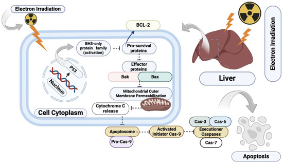 A crucial role in initiating the intrinsic apoptosis pathway through the Bcl-2 family of proteins is played by p53. It initiates an increase in the expression of the pro-apoptotic proteins Bax and Bak, and a reduction in anti-apoptotic factors like Bcl-2 and Bcl-xl (Figure 11) [41]. These changes enhance mitochondrial membrane permeability, activating caspase 9 and subsequently caspase 3, the final executioner of apoptosis [42,43]. Consistent with this mechanism, our real-time PCR analysis showed significant upregulation of Bax mRNA and elevated expression of caspase-3, indicating a strong apoptotic shift in the liver cells post-irradiation. This was further confirmed by the immunohistochemical examination, which revealed increased caspase-3 immunostaining and reduced proliferative activity, as evidenced by lower Ki-67 values.