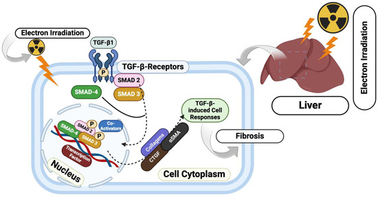 The presence of evidence of moderate fibrotic changes 3 months after electron irradiation is attributed to the inflammatory response in the early period of RILD, and possibly due to the activation of hepatic stellate cells (HSCs), which play a key role in the pathogenesis of radiation-induced liver fibrosis [44,45,46] through the production of TGF-β1 and the subsequent activation of TGF-β1/Smad/CTGF (Figure 12).