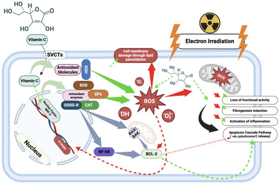 Vitamin C, a potent antioxidant and free radical scavenger [47,48], was selected as a radioprotector in this study due to its dual ability to mitigate both indirect and direct radiation damage. This substance not only neutralizes reactive oxygen species (ROS), reactive nitrogen species (RNS), and lipid peroxidation products across various organs during irradiation but also exhibits a unique capacity to protect DNA from electron-induced damage by reducing Cu2+ ions, which was shown in in vitro studies [49,50]. Among antioxidants, vitamin C stands out for its ability to reduce single- and double-strand DNA breaks, thereby offering robust protection against radiation damage.