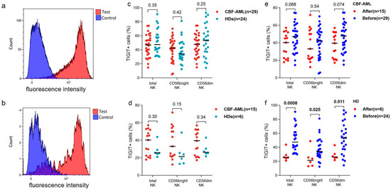 In CBF-AML patients, the frequencies of TIGIT+ cells in total NK and CD56dim NK cells after stimulation (n = 15) showed a tendency to be significantly lower compared with those of samples without stimulation (n = 29) (40.3% (17.9–57.2%) vs. 46.9% (14.7–74.3%), p = 0.088; 39.5% (17.3–57.0%) vs. 47.8% (15.0–74.5%), p = 0.074), but that in CD56bright NK cells was similar (p = 0.54) (Figure 1e). Whereas in HDs, all the above three comparisons were significant (25.6% (21.0–43.8%) vs. 47.4% (30.1–90.8%), p = 0.0008; 21.5% (13.0–48.9%) vs. 34.2% (12.4–81.2%), p = 0.025; 26.3% (21.7–43.0%) vs. 53.4% (14.3–92.8%), p = 0.011) (Figure 1f). Likely, the pairwise comparison before and after stimulation of five patients and five HDs showed a similar trend (Figure S3). Even so, the frequencies of TIGIT+ cells in total NK, CD56bright, and CD56dim NK subsets remained similar between patients and HDs after stimulation in vitro (p = 0.30, 0.15 and 0.34) (Figure 1d).