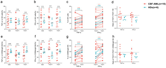 The impact of TIGIT expression on NK cell cytokine production in CBF-AML patients and HDs. TNF-α+ cells% in total NK cells (a), INF-γ+ cells% in total NK cells (b), TNF-α+ cells% and INF-γ+ cells% in pairing of TIGIT+ to TIGIT− cells in total NK cells of individual cases (c), TNF-α+ cells% and INF-γ+ cells% ratios of TIGIT+/TIGIT− NK cells (d), TNF-α+ cells% in CD56bright NK cells (e), INF-γ+ cells% in CD56bright NK cells (f), TNF-α+ cells% and INF-γ+ cells% in pairing of TIGIT+ to TIGIT− cells in CD56bright NK cells of individual cases (g), and TNF-α+ cells% and INF-γ+ cells% ratios of TIGIT+/TIGIT− CD56bright NK cells (h). Numbers in this figure refer to the p values.